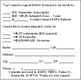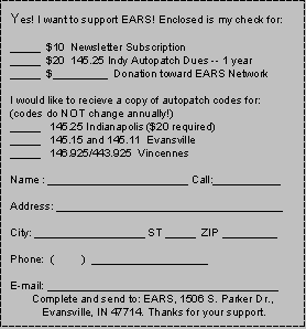 HAVE YOU SEEN THE E.A.R.S. WORLD WIDE WEB PAGE LATELY?? It has been updated recently! Features include a new look, sound clips, and most of all the ability to read newsletters online rather than download. Check it out at http://members. aol.com/earsham/index.html