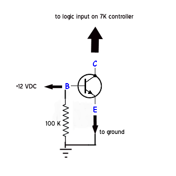 The RVS-8 provides +12VDC through a 1K resistor on the pin that corresponds to the receiver channel being voted. The 7K does not respond to +12 VDC, but rather a ground signal. In order to turn the +12 VDC into a ground, you must invert the signal. This can be done with a relay. Or, another way is to use a 2N2222 NPN type transistor.